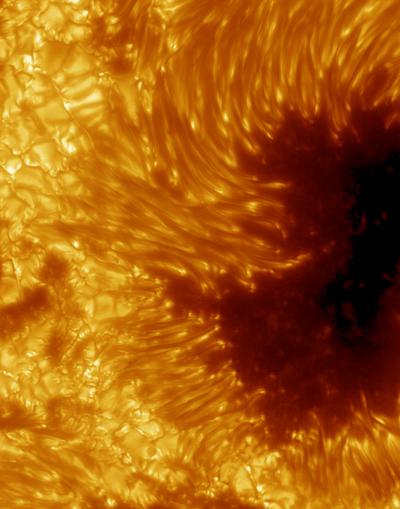 Esta espectacular imagem mostra com um detalhe nunca antes alcançado a região central escura de uma mancha solar do tamanho da Terra. Estruturas designadas por cabelos e canais são núcleos escuros visíveis por entre os filamentos brilhantes que se estendem até à mancha solar. Estas eram, até agora, desconhecidas. A resolução espacial de 100 km conseguida pelo telescópio solar sueco de 1 metro já ficou na história! Espera-se que com esta resolução se possam estudar processos que ocorrem em escalas menores do que 100 km, e talvez se descubram as respostas a muitas das perguntas que ainda subsistem hoje sobre as manchas solares. Sabe-se que as manchas solares são concentrações de campos magnéticos fortes e que são regiões mais frias que o resto da superfície solar, aparecendo, por isso, escuras no disco solar. Mas, por exemplo, não se sabe como se formam, o que as faz estáveis para durarem semanas, ou o que provoca o ciclo solar de 11 anos. Esta mancha solar é a maior de um grupo catalogado como a região solar activa AR 10030.